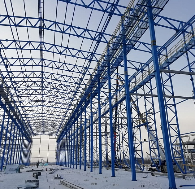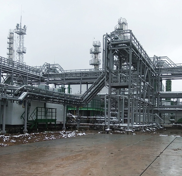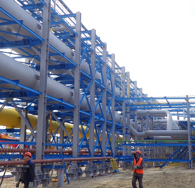 Дожимная компрессорная станция на УКПГ-1С Заполярного НГКМ (1 очередь). Металлоконструкции эстакады под коммуникации в районе цеха очистки газа.